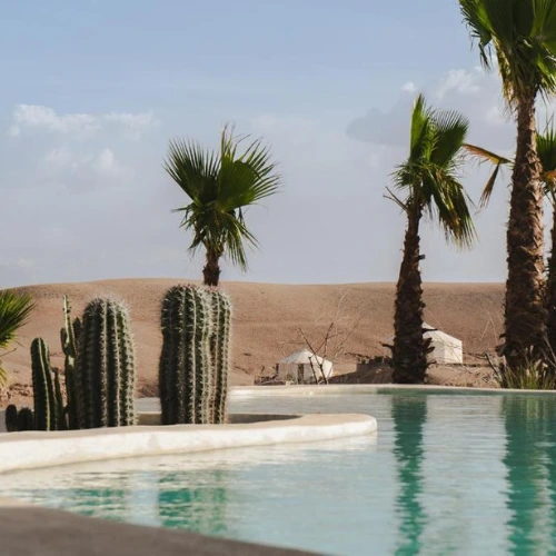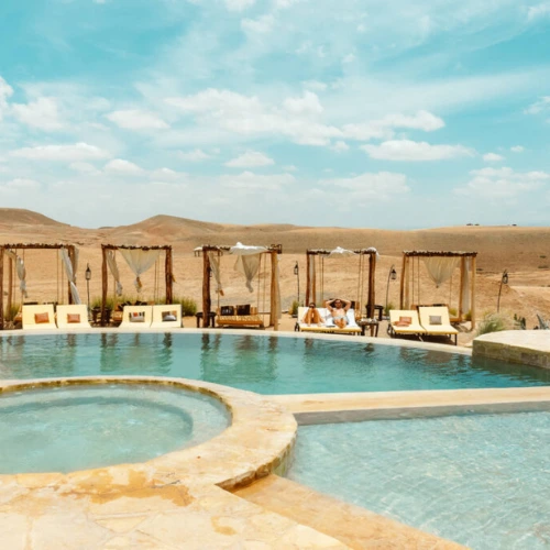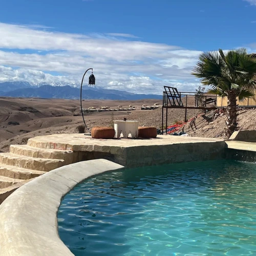 Be Agafay est un camp de luxe niché dans le désert d’Agafay, à 1h de route de Marrakech. L’accès est difficile sans 4×4, mais un service de chauffeur est proposé. Vous y trouverez une piscine originale, un jacuzzi chauffé, une cuisine raffinée, et parfois des spectacles traditionnels en soirée. Plusieurs formules sont disponibles (déjeuner, dîner, sunset, etc.) à partir de 50€.