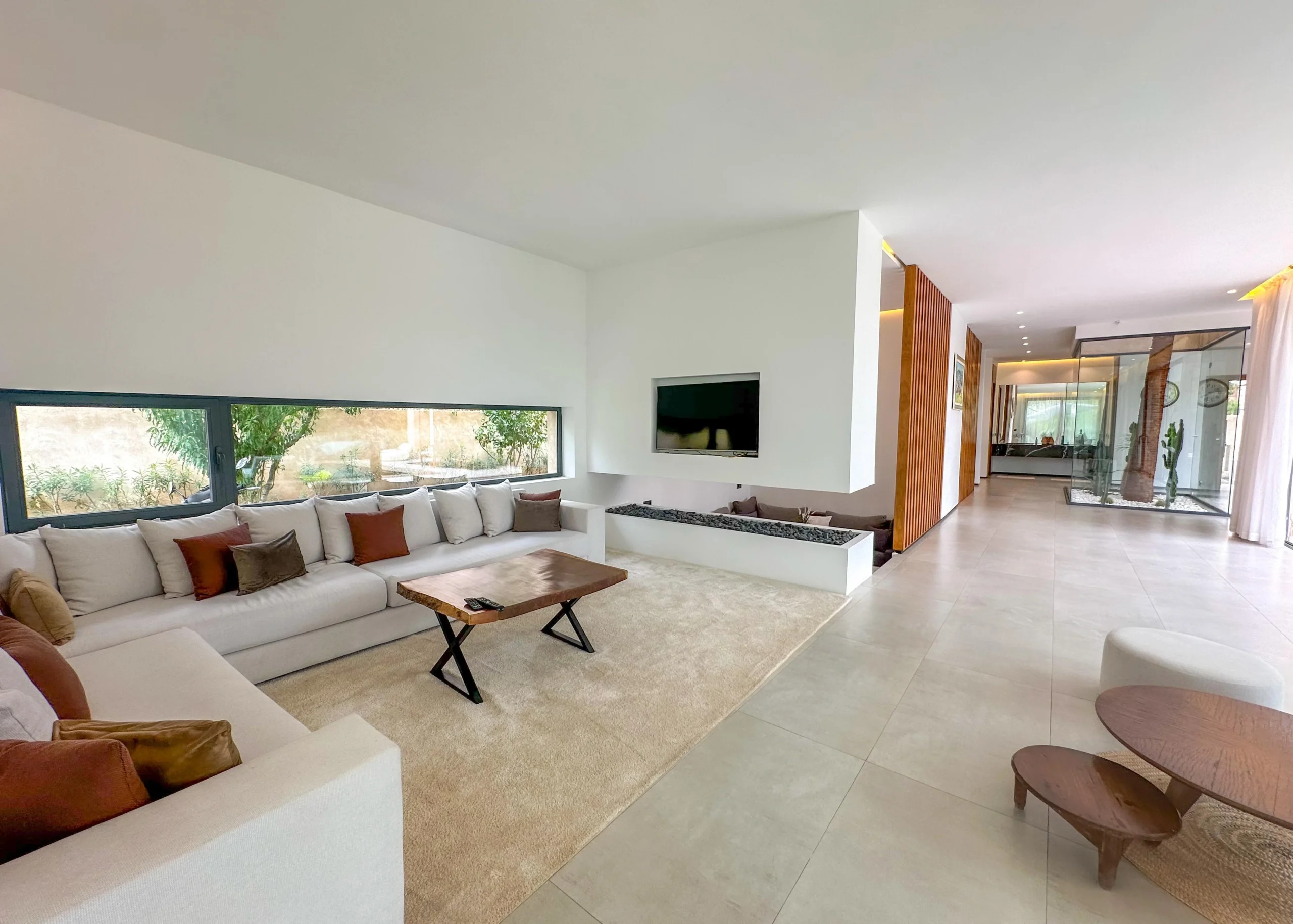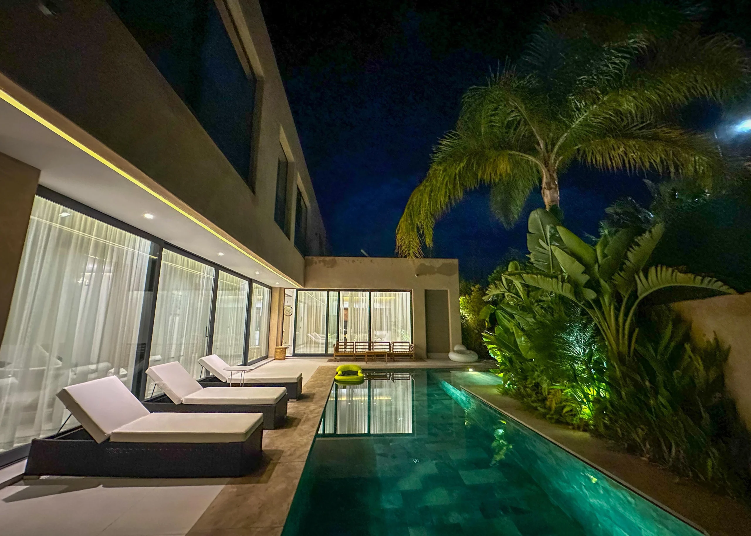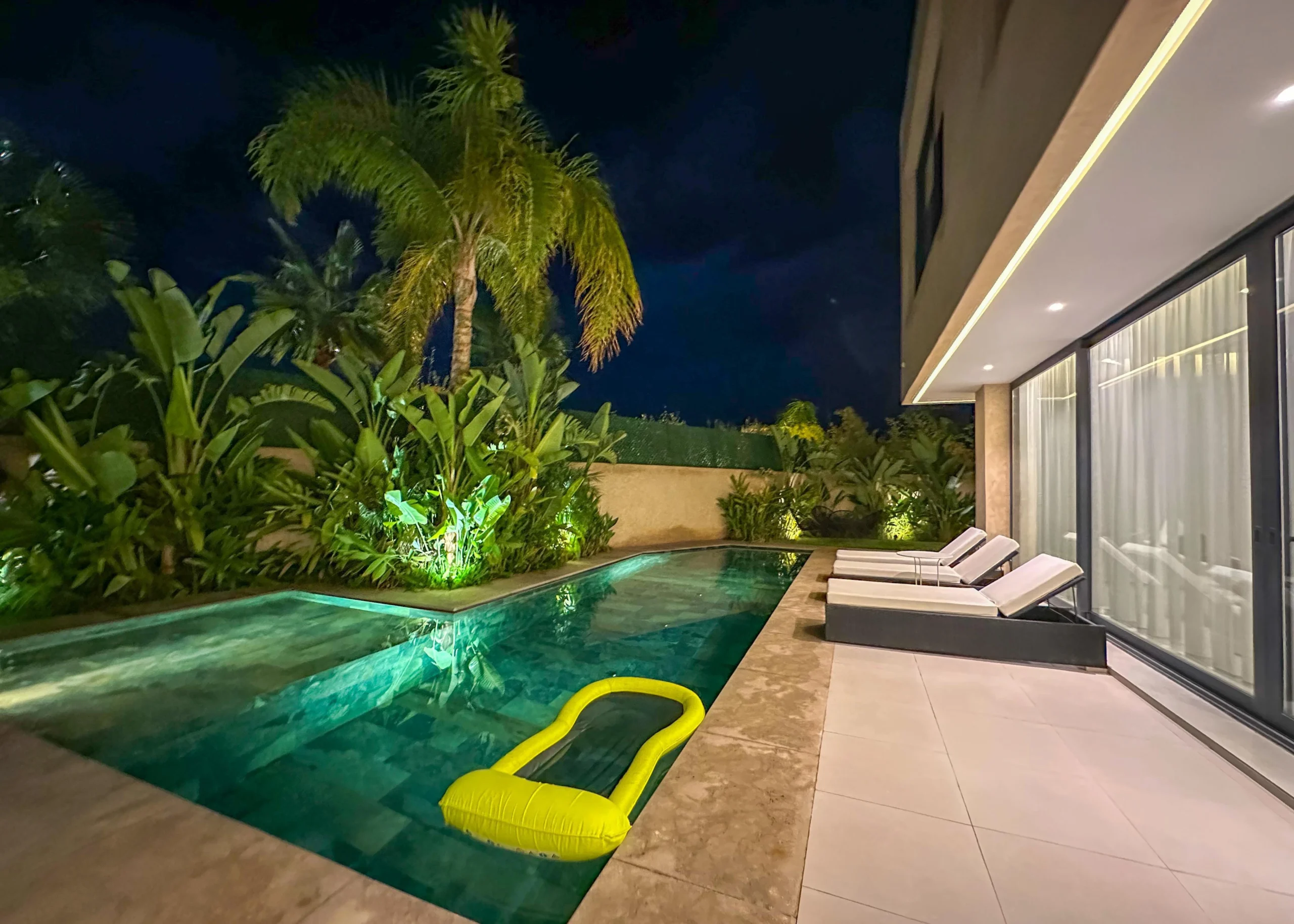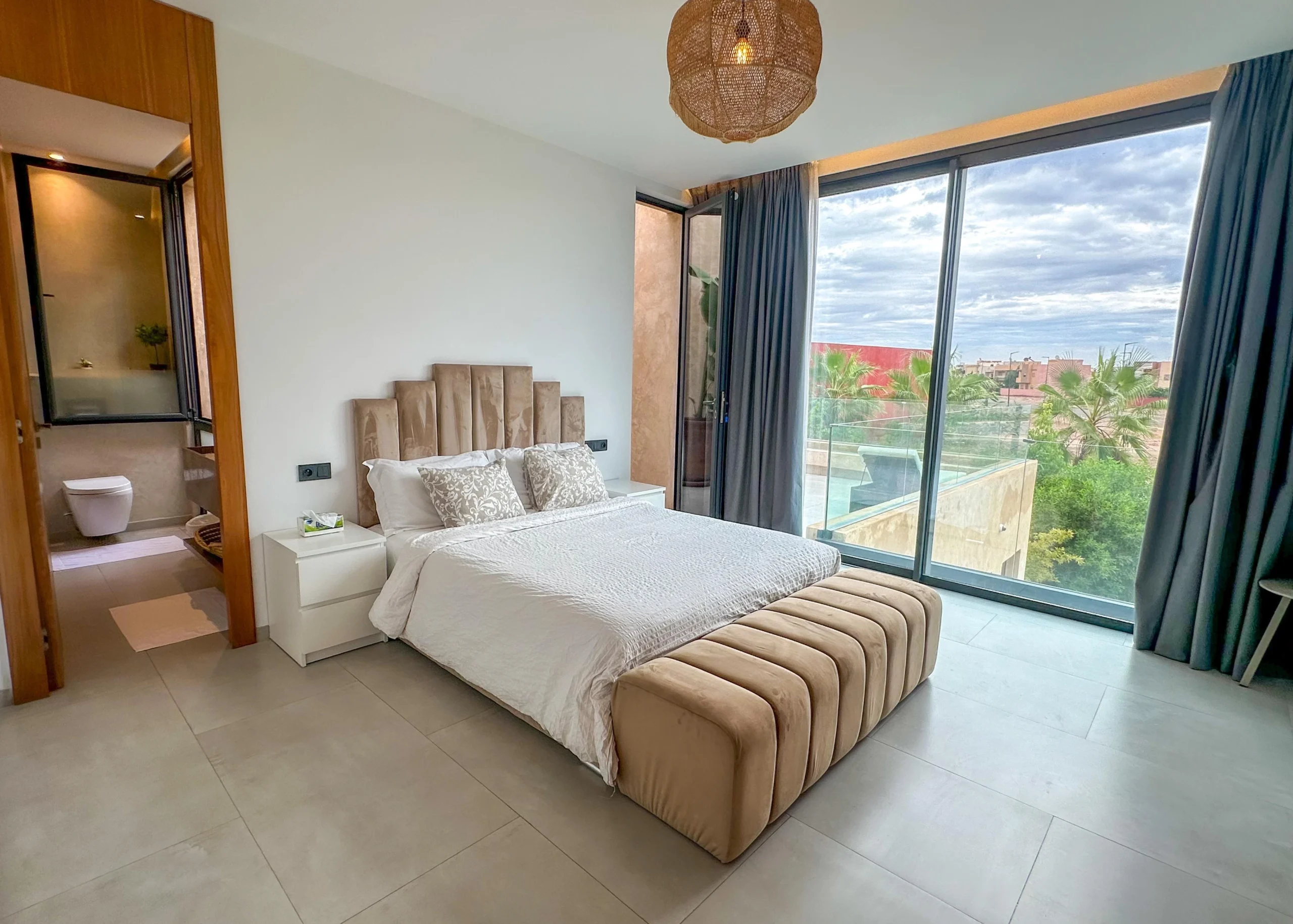 À seulement 9 km de Marrakech, découvrez cette villa contemporaine nichée dans une résidence calme et sécurisée, idéale pour un séjour entre confort, intimité et services hôteliers.