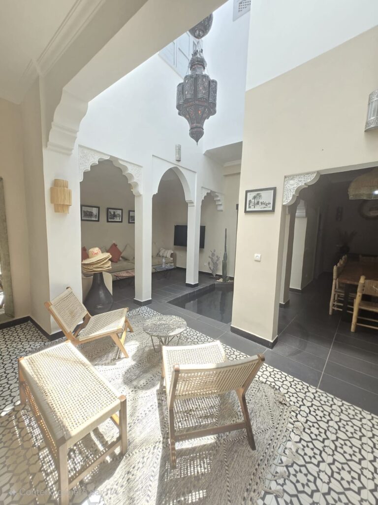 Au rez-de-chaussée, laissez-vous séduire par le charme d’un patio lumineux où trône un bassin décoratif illuminé le soir. Les espaces communs comprennent également un salon marocain chaleureux avec TV satellite et Wifi, une salle à manger conviviale et une cuisine équipée.