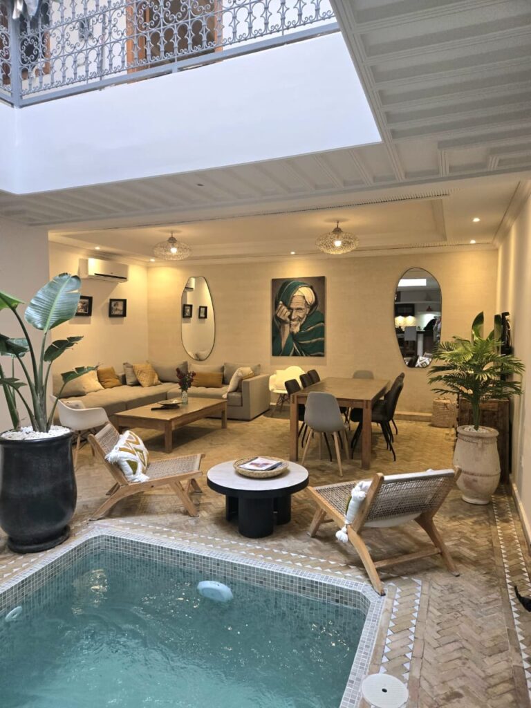 Derrière ses portes, découvrez un havre de paix : patio avec bassin chauffé, rooftop avec vue sur la Koutoubia et l’Atlas, ambiance sereine et décoration raffinée.